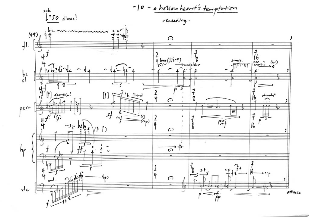 The presence of memories in the form of dust and decay are interlaced throughout the materials played by the ensemble. The entwining of instrumental voices and textures into one another are deployed in a strange web of activities, activating the resonances – a smoldering pit of the world’s ashiest fruit, no longer ripe, now frayed and defeated – and responding to one another. a hollow heart’s temptation (2022) is a work born from a period of punitive reflection on one’s inability to control the unbridled love and passion, and the resignation that can follow.