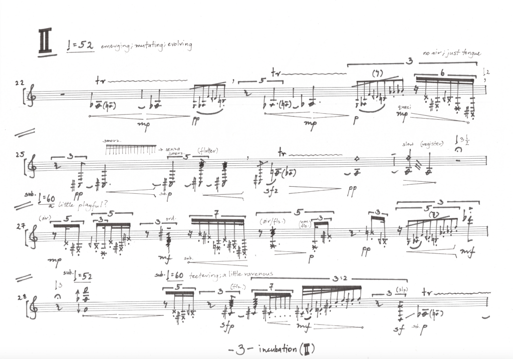 incubation (2020) was quite a unique work in my oeuvre. It thrust me in a direction that engaged more subtle, static and even strangled sounds in a drawn-out, slowly morphing pattern. The work’s title suggests much of the immediate sound quality is internal and expands outwards, but is also relevant to the nature of the instrument and the techniques that I explored with Richard throughout the process of writing.
