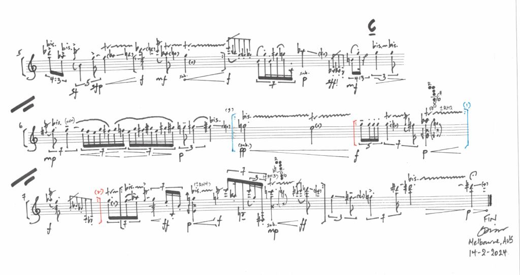 Quivering; shivering, shimmering; glimmering. serous (2024) is a gestural miniature that grows from a relentless stream of consciousness – a serum of sentience – which is riddled with loops that glitch through the apparent linearity, unfurling mellifluous tumult in its wake. The clarinet is treated as a sliding surface, bending and buckling from the feverish fluidity of the line while maintaining a persistent energy. Much like the title suggests, the work is defined by a certain translucency; the exsanguinating trills that are broken up by more agile articulated passages; these are seamlessly paired against one another, retaining a sense of deliquescence despite the interjection of textured elements. serous is dedicated to Szilárd as part of the Rucksack-Projekt.